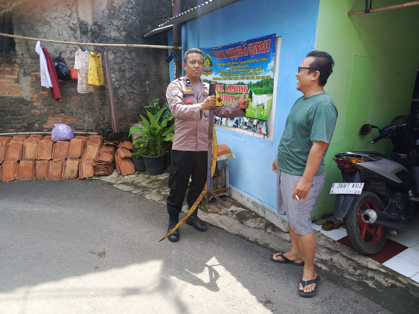 Pada Rabu, 15 Januari 2025, pukul 10.15 WIB, Bhabinkamtibmas Kelurahan Bekasi Jaya, Aipda Heryanto, menerima penyerahan dua bilah sajam dari Ketua RT 02/01, Bapak Muklis, di rumahnya. Sajam yang diserahkan berupa satu bilah pedang dan satu bilah clurit hasil modifikasi dengan panjang sekitar 100 cm. Kedua barang ini ditemukan oleh warga di lingkungan RT 02/01.