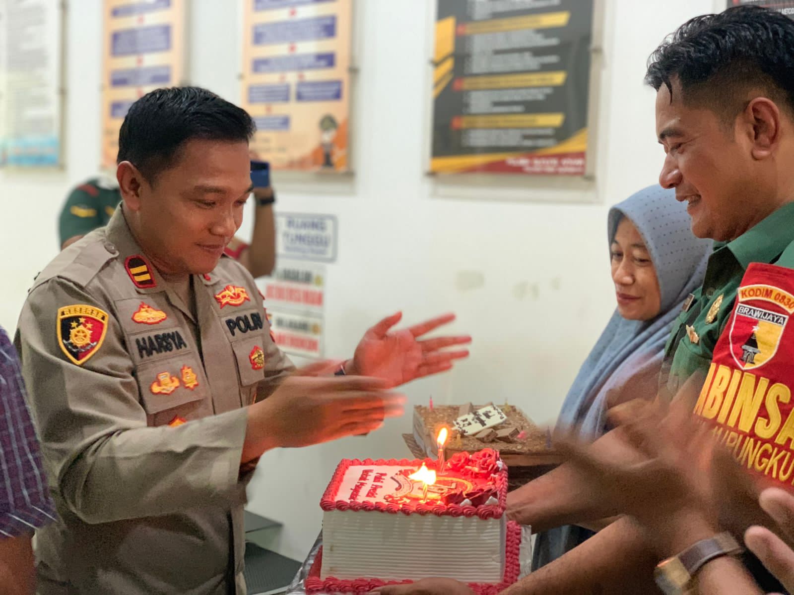 Kejutan berupa kue tart diserahkan langsung kepada Kapolsek sebagai simbol penghargaan atas dedikasi Polri dalam menjaga keamanan dan ketertiban masyarakat di wilayah kecamatan Gunung Anyar.