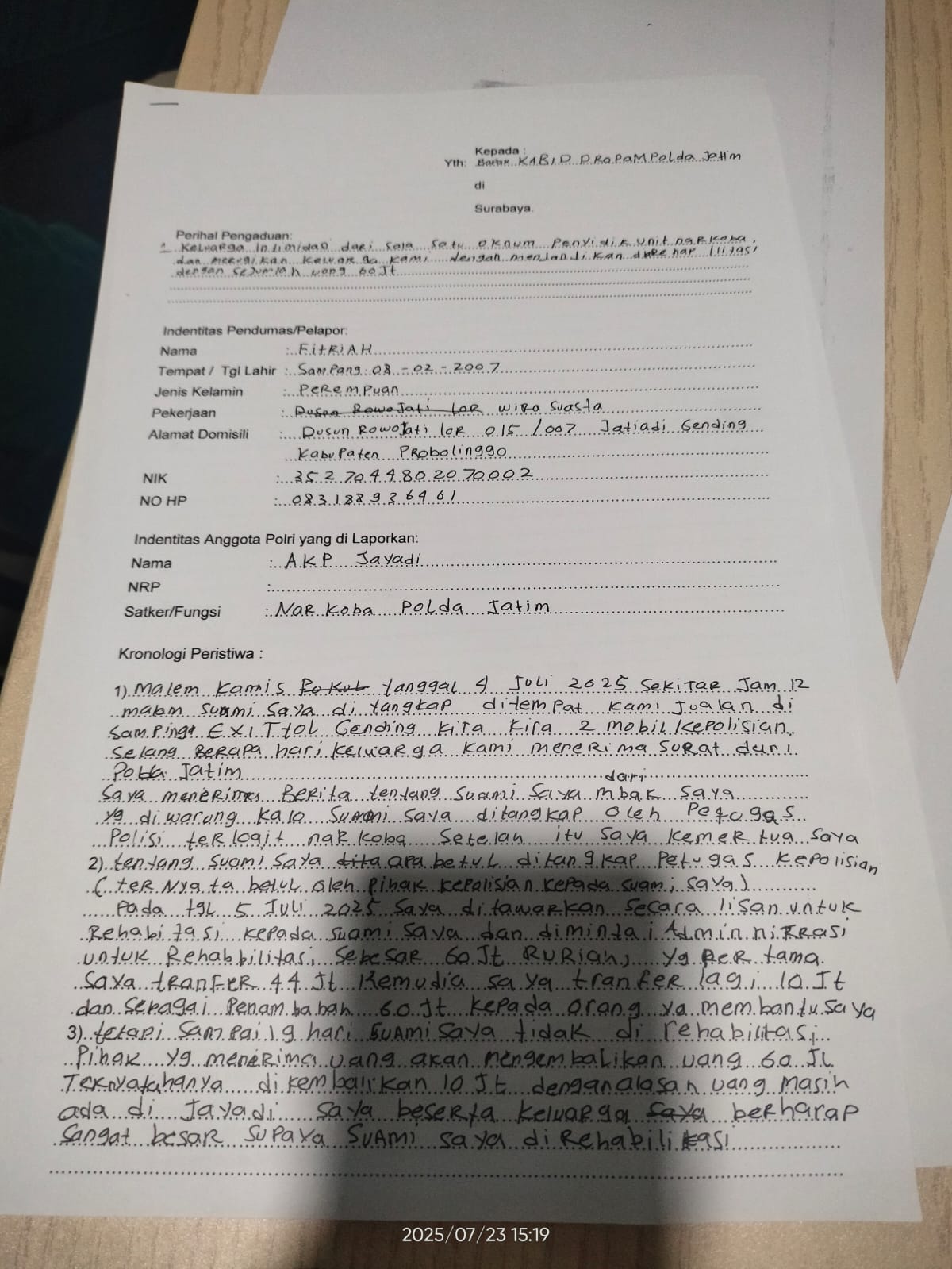 Karena dugaan penipuan itulah, dia mengadukan secara tertulis kepada Bidang Profesi dan Pengamanan (Propam) Polda Jatim pada Rabu, 23 Juli 2025.