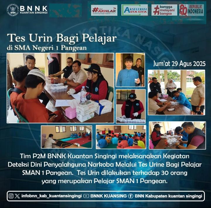 Metro24, Kuantan Singingi – Dalam rangka menciptakan lingkingan sekolah yang bersih dari narkoba, BNN Kabupaten Kuantan Singingi melaksanakan kegiatan Deteksi Dini Penyalahgunaan Narkoba melalui Tes Urine kepada 30 Orang Pelajar di SMAN 1 Pangean.