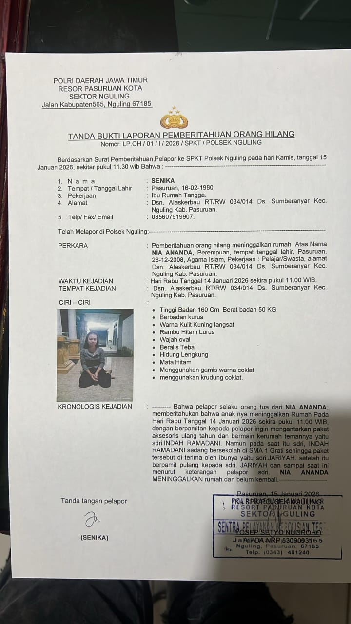 Laporan orang hilang tersebut telah diterima dan dicatat oleh Polsek Nguling, Polres Pasuruan Kota, dengan Nomor: LP.OH/01/I/2026/SPKT/Polsek Nguling, yang dibuat oleh orang tua korban, Senika, pada Kamis, 15 Januari 2026.