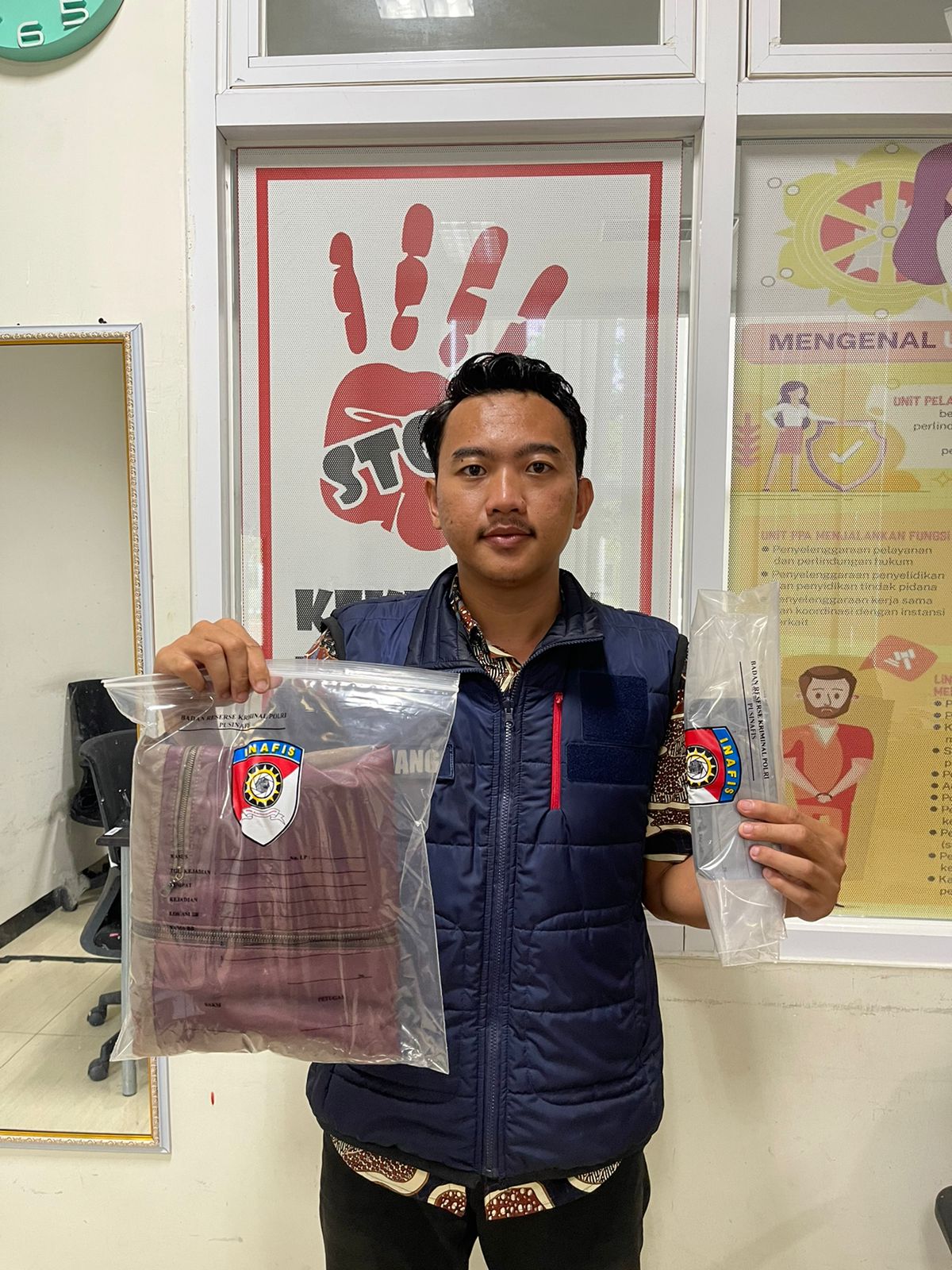 Dari tangan pelaku, polisi turut mengamankan sejumlah barang bukti, di antaranya jaket warna coklat kombinasi merah tua, baju ketelpak warna biru muda, sepeda motor Honda PCX putih nopol W 4150 FU, helm hitam, Handphone, Rekaman CCTV di sekitar TKP.