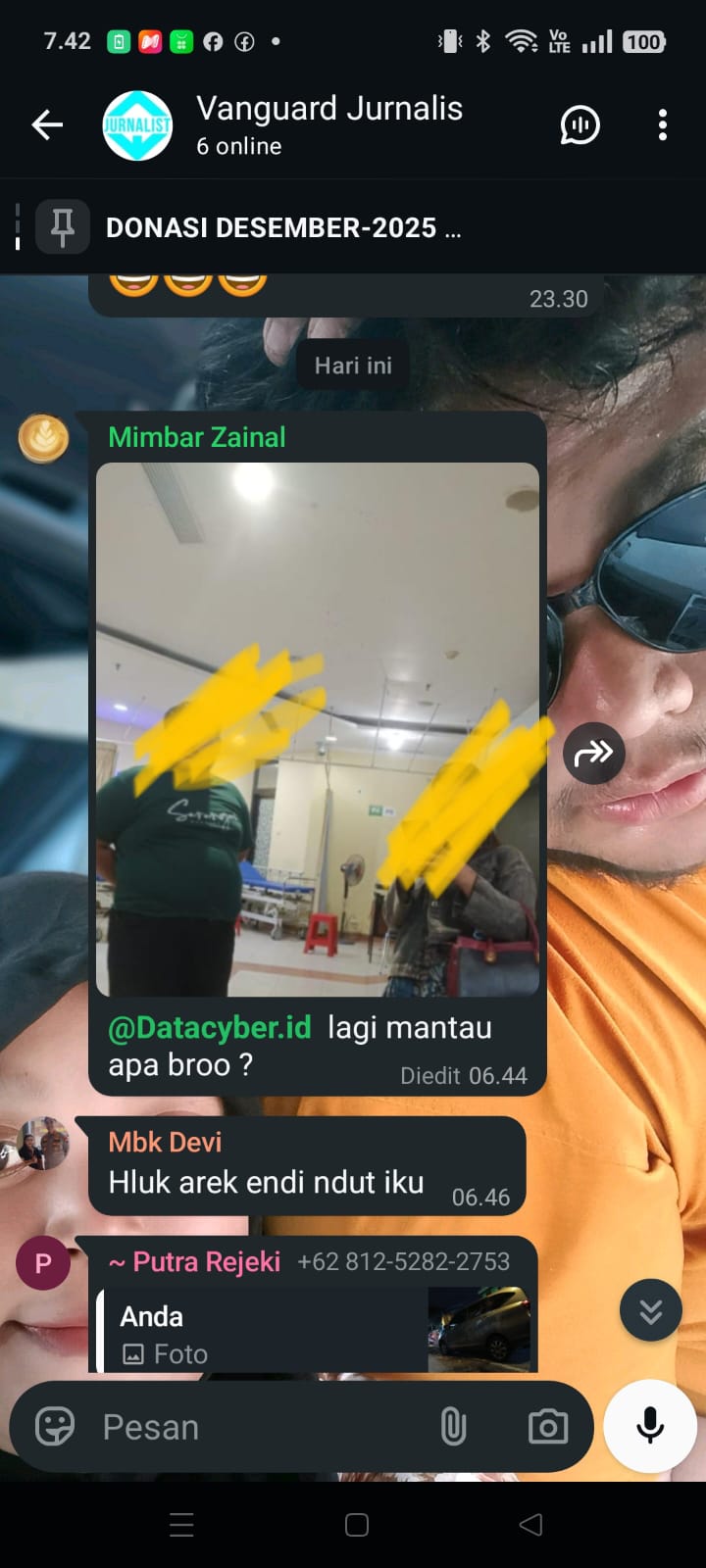 Metro24, SURABAYA – Dugaan penyebaran foto tanpa izin di sebuah grup WhatsApp wartawan bernama Vanguard menjadi sorotan publik. Seorang yang disebut-sebut sebagai Pemimpin Redaksi media online Mimbar-Demokrasi.com berinisial Z diduga telah mengunggah sebuah foto ke dalam grup tersebut, yang di dalamnya terdapat Pemimpin Redaksi Datacyber.id.