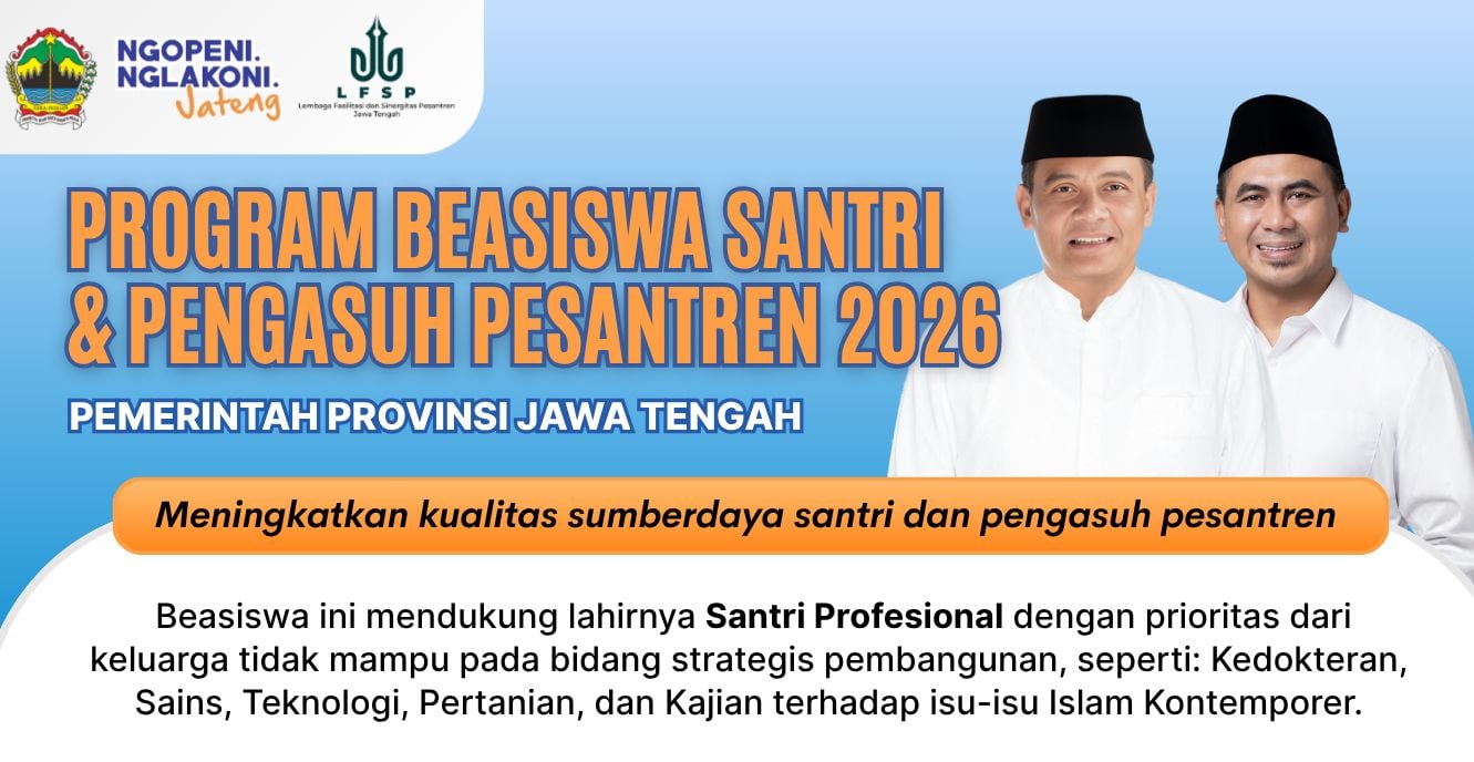 Pemerintah Provinsi Jawa Tengah resmi meluncurkan Program Beasiswa Santri dan Pengasuh Pesantren Tahun 2026 yang memungkinkan santri melanjutkan studi, baik di dalam negeri maupun ke berbagai negara tujuan luar negeri, dari kawasan Timur Tengah hingga Asia Timur.