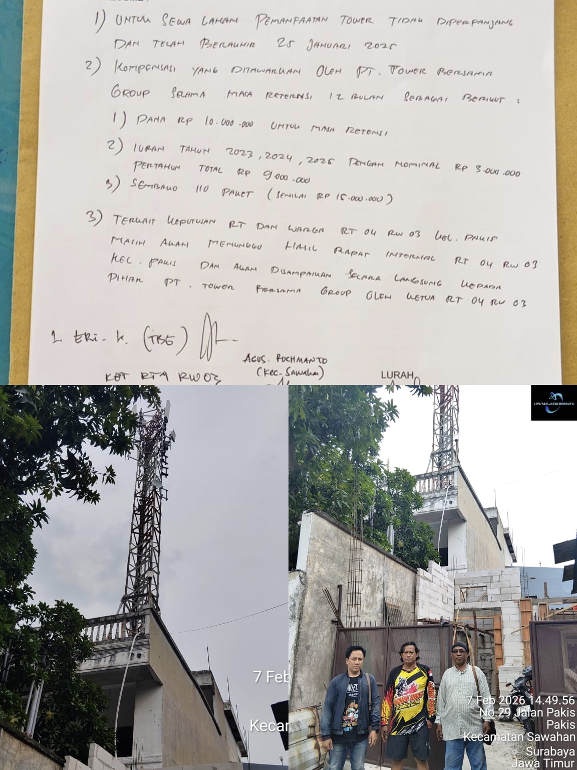 Warga RT 04 RW 03 menyebutkan, perjanjian pendirian tower tersebut dibuat secara resmi dan disepakati bersama masyarakat setempat, bahkan disaksikan oleh pihak kelurahan dan kecamatan. Namun, berakhirnya masa perjanjian justru tidak diikuti langkah konkret dari pihak pengelola tower, sehingga memunculkan dugaan kuat adanya pengabaian terhadap kesepakatan yang telah disahkan secara administratif.