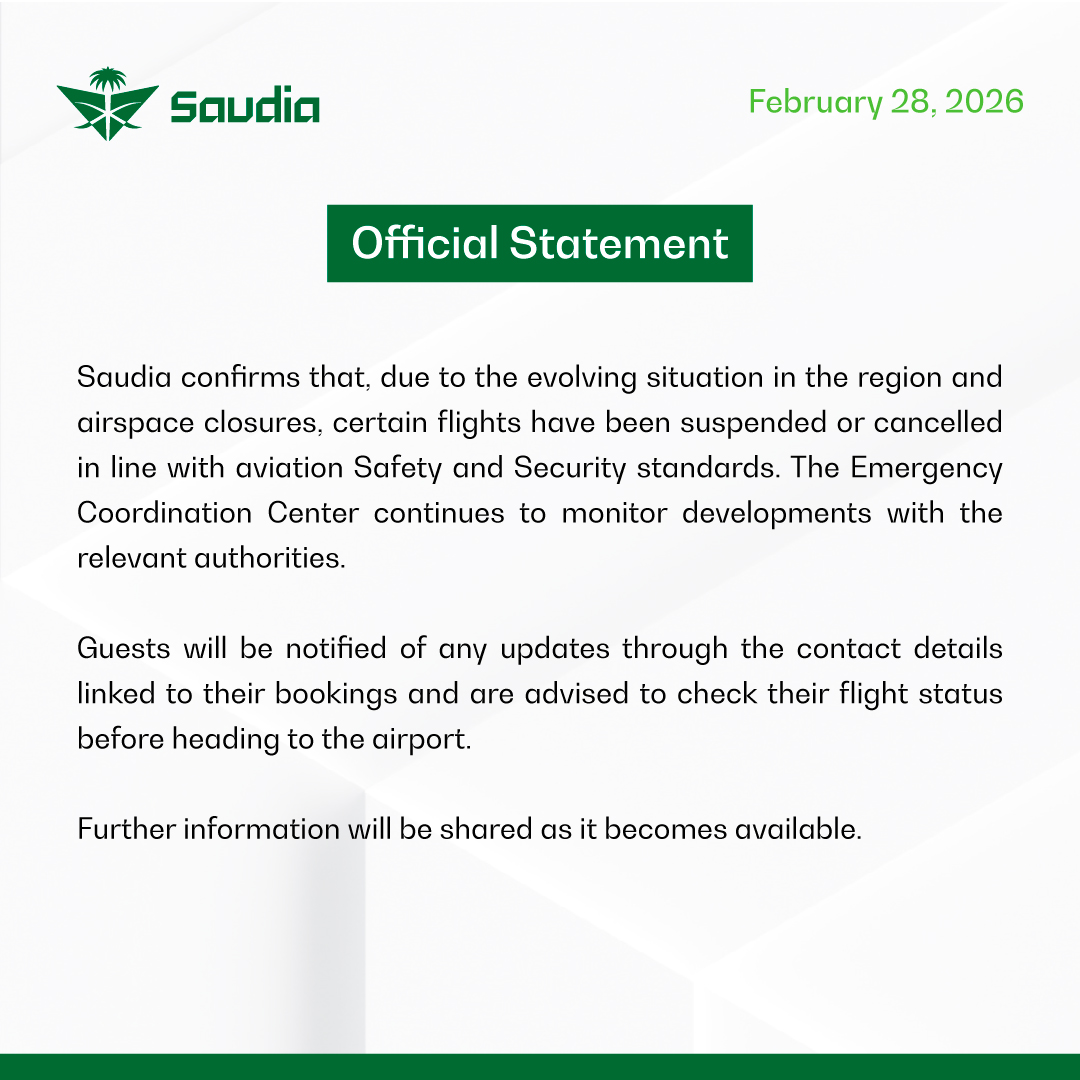 Dalam pernyataan resmi yang disampaikan melalui akun X Saudia Group pada 28 Februari 2026, maskapai menegaskan bahwa langkah tersebut diambil demi memastikan keselamatan penumpang dan awak pesawat.